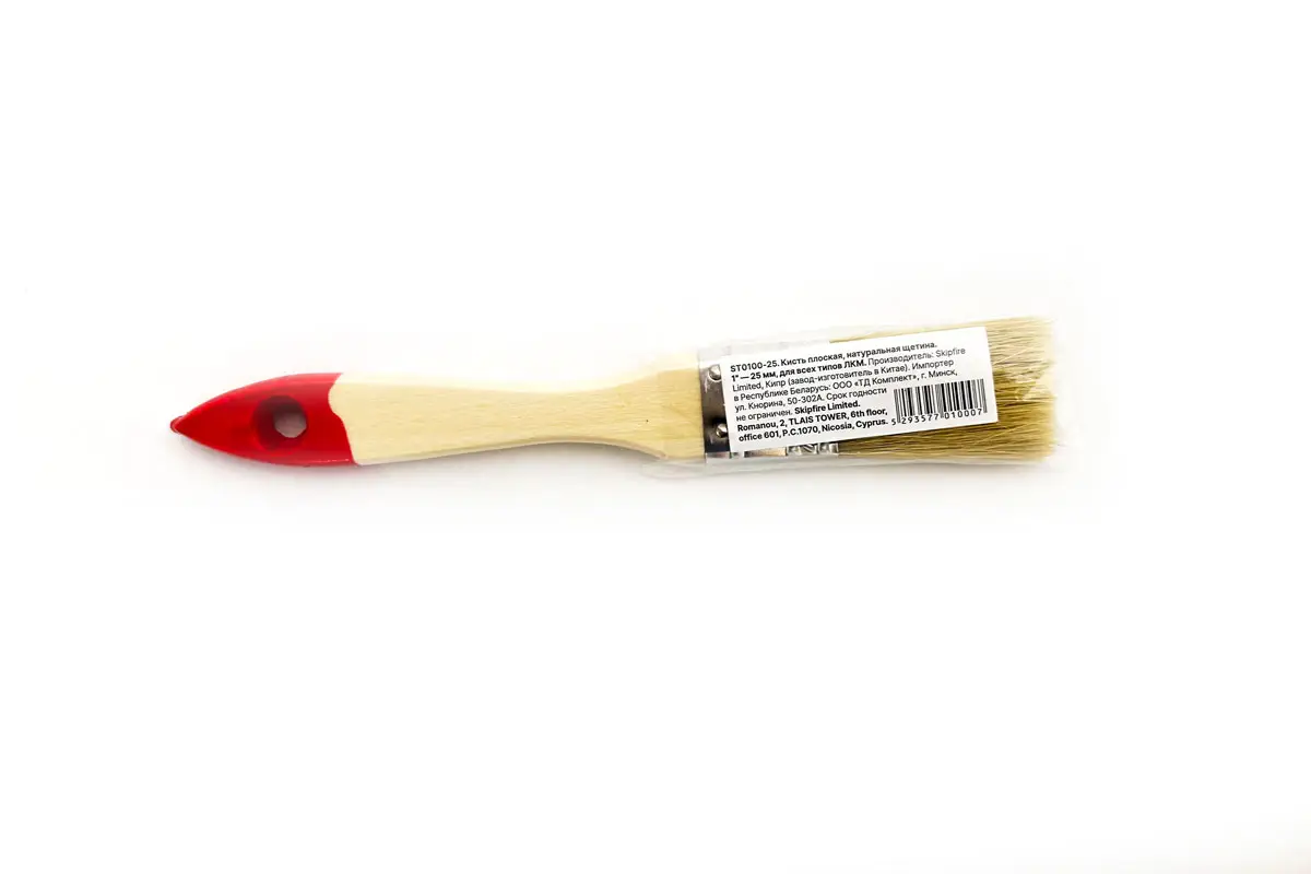 Еще одним значимым элементом является деревянная ручка кисти, которая обеспечивает надежный захват и комфорт в процессе работы. Толщина щетины 10 мм и ее ширина 25 мм оптимальны для работы как с крупными, так и с мелкими участками, позволяя быстро и качественно покрывать большие площади. Малярная кисть идеально подходит для различных типов красок и лаков, что делает ее универсальным инструментом для внутренних и наружных работ.